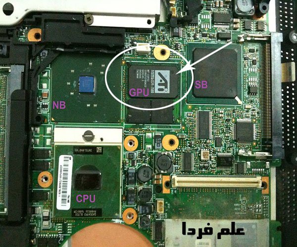 با این حال ، امروزه به دلیل پیشرفت تکنولوژی و استفاده از متدهای لحیم کاری حرفه ای ، شاهد چیپ های گرافیک رو لپ تاپ ها هستیم . در این گونه لپ تاپ ها دیگه خبری از کارت گرافیک به شکل بالا نیست و چیپ گرافیک و همینطور حافظه های گرافیکی روی مادربورد لحیم شدن . مثلا در شکل زیر چیپ گرافیک ATI رو در کنار دو عدد چیپ حافظه گرافیکی ، چیپ ست پل جنوبی ( SB ) و چیپ ست پل شمالی ( NB ) می تونید ببینید که روی مادربورد لحیم شدن .